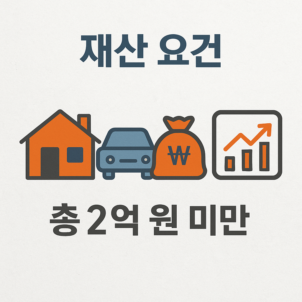 • 가구원 전체 재산 합계 2억4천만 원 미만 (주택, 토지, 예금, 자동차, 주식 등 포함)